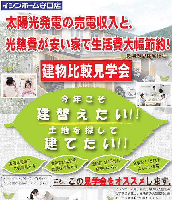 8月29日(土)、30日(日) 建物構造見学会を開催します こちらの見学会は終了致しました。 ご来場ありがとうございました。 建物比較見学会 ご来場プレゼント お約束 押しかけ営業等は一切ございません。 安心して、家づくりに必要な知識や情報を得てお帰りください。